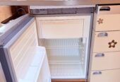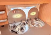 Kuchyň s zánovní kompresorovou lednicí 12V, nerezový dřez a sporák na PB