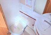 Koupelna s kazetovým WC,sprchová vanička,umyvadlo,skříňky,zrcadlo
